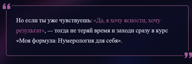 Но если ты уже чувствуешь: «Да, я хочу ясности, хочу результат», — тогда не теряй время и заходи сразу в курс «Моя формула: Нумерология для себя».